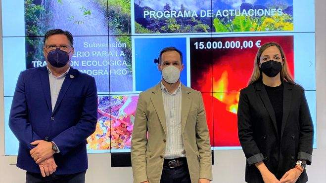 El presidente de la Fundación Canaria Reserva Mundial de la Biosfera La Palma y del Cabildo, Mariano Zapata; la consejera insular de Medio Ambiente, María Rodríguez, y el director ejecutivo de la Fundación, Ernesto Aguiar, han dado a conocer hoy los ejes de actuación enmarcados en la subvención de 15 millones de euros otorgada por el Ministerio para la Transición Ecológica y el Reto Demográfico en el marco de las medidas urgentes adoptadas por el Ejecutivo Nacional de apoyo para la reparación de los daños ocasionados por el volcán y para la reconstrucción económica y social de La Palma.