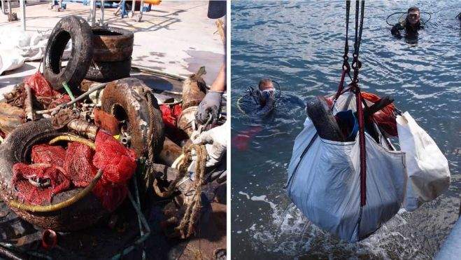 Durante la jornada se retiraron 210 kg de residuos destacando la presencia de 6 neumáticos, gran cantidad de mangueras, gafas de buceo, latas y botellas plásticas