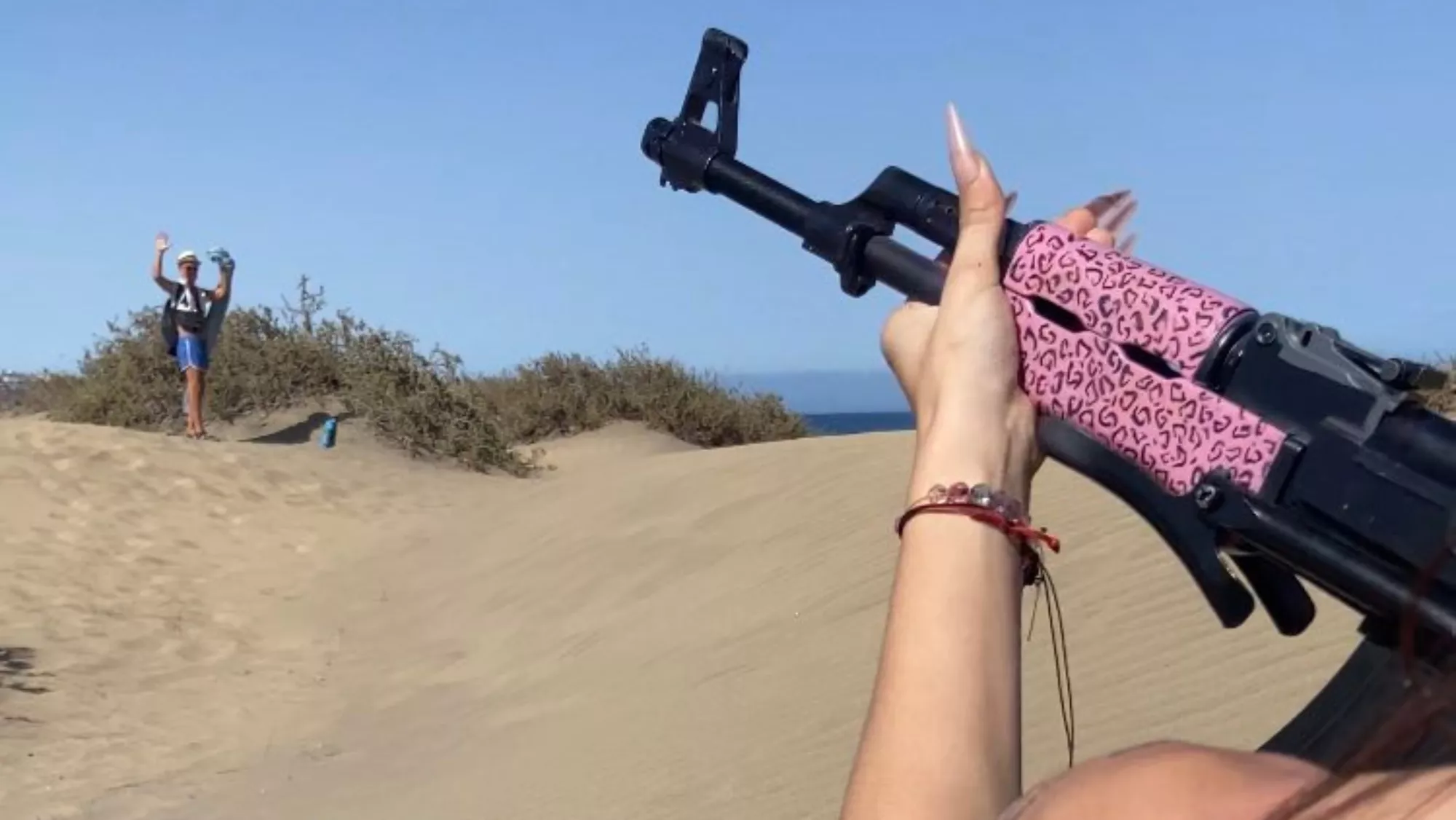 Con una réplica de un fusil de asalto soviético AK-74U con estampado de leopardo rosa y con un cigarro en la boca. Es la curiosa estampa de cómo ha ahuyentado una joven canaria a un hombre que, según dice la joven en su cuenta de X (Twitter), se estaba masturbando mirándoles a ella y a su amiga escondido en unos matorrales.