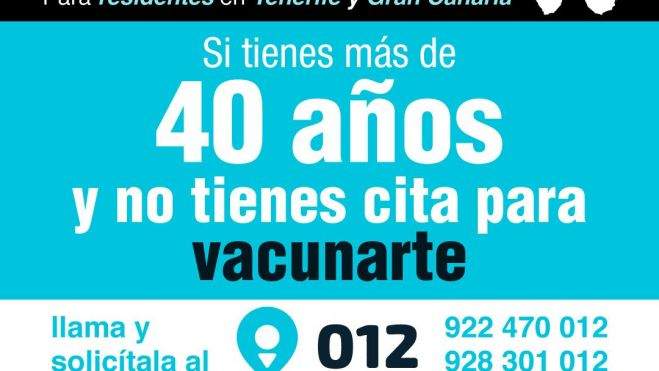 La Consejería de Sanidad del Gobierno de Canarias informa que desde hoy jueves, 17 de junio, los residentes en Gran Canaria y Tenerife mayores de 40 años que aún no hayan recibido cita para la primera dosis de la vacuna pueden llamar para solicitarla a través del 012 (o en el 928 301 012 o 922 470 012).A partir de hoy las personas de estos grupos de edad, nacidos en 1981 o antes de esa fecha, también podrán realizar esta solicitud en el apartado miCitaPrevia de la web miSCS, el portal de servicios digitales personalizados para usuarios del Servicio Canario de la Salud (SCS).