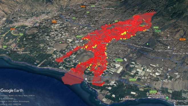La superficie afectada por el volcán de La Palma abarca ya las 640,27 hectáreas y la anchura total de las tres lenguas alcanza ya los 1770 metros. Según informa el DSN la lengua de lava que obligó al desalojo de 800 vecinos ya ha perdido fuerza. Pero el brazo que discurre más al sur "acumula el máximo de energía desde el punto emisor y se mueve a unos 50 metros por hora", informa.