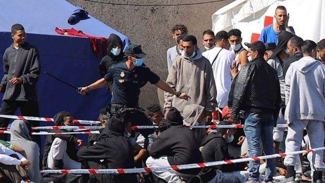 El campamento de emergencia para inmigrantes del puerto de Arguineguín (Gran Canaria) ha sido escenario este lunes de escenas de tensión entre parte de sus ocupantes y la Policía, con cerca de 2.000 personas hacinadas en el muelle, muchas de ellas sin sombra bajo la que protegerse.Tras un fin de semana que ha batido dos récords de llegadas de inmigrantes a Canarias, el diario (1.461, el sábado) y el acumulado en 48 horas (2.118), el campamento de Arguineguín, que se montó a mediados de agosto para albergar a un máximo de 400 personas, comenzó la jornada con 1.871 y cada vez menos espacio para cada una.Y a lo largo de la mañana, la Salvamar Menkalinan ha desembarcado en ese puerto del sur de Gran Canaria a otros 171 inmigrantes, recogidos de seis pateras en aguas al sur de la isla.Sobre el mediodía, un grupo de jóvenes magrebíes que estaban sentados en el borde del muelle comenzaron a saltar a las pateras amarradas al puerto, a recoger cosas de ellas y a lanzarlas a sus compañeros.Cuando la unidad del Cuerpo Nacional de Policía que cuida de la seguridad del muelle se dio cuenta de lo que estaban haciendo, cortó la escena de forma expeditiva: a golpes de porra.
