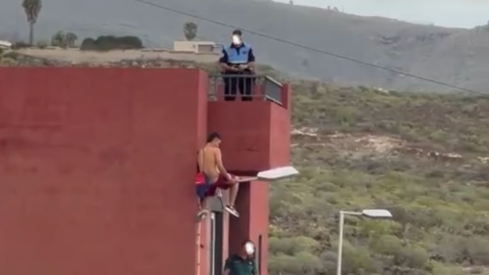 VÍDEO | Supuesto intento de ocupación en Arona: huye de la vivienda subiéndose a una farola