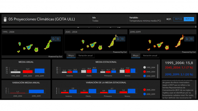 Los datos del panel están además acompañados del estudio Proyecciones futuras de alta resolución de temperatura y precipitación en Canarias, cuyas conclusiones indican que “los mayores cambios de temperatura se esperan en la alta montaña” y que la disminución general de la precipitación anual “es la causa principal de la disminución de la humedad del suelo, lo que a su vez provoca el aumento de la DTR (rango de temperatura diurna)”, entre otras cuestiones.