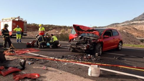 Los heridos fueron trasladados a dos centros sanitarios del sur de la isla.Los bomberos liberaron a la mujer de 44 años que había quedado atrapada en el interior del vehículo.🔴#BomberosTF de San Miguel 🚒 rescataron esta tarde a una mujer en un accidente de tráfico con colisión entre 2 coches en la TF-655 (entre Guaza y Los Cristianos). La afectada fue liberada y trasladada a la ambulancia del #SUC. Se colaboró con servicios sanitarios y @OPC_GCivil pic.twitter.com/8jI2pSsKU8