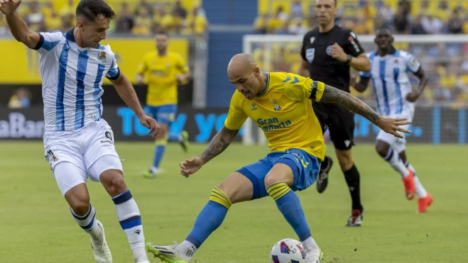 Álvaro Valles evitó la ventaja realista en dos claras ocasiones, primero saliendo a los pies de Oyarzabal y después con un cabezazo a bocajarro de Zubimendi, en el mejor momento visitante en el choque, poco antes del estreno del ruso Zakharyan. Así lo entendió Pimienta con un triple cambio en Las Palmas para meter músculo, prescindiendo del talento de Viera, Kirian y Sandro.