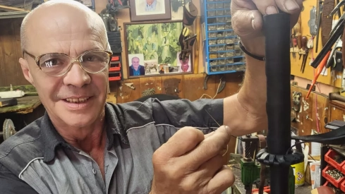 Mario no tiene un aprendiz que pueda seguir con la tradición. “La locura mía no la puede sustituir nadie”, asegura mientras se ríe. “Esto es una forma de vivir única”. Y tanto que lo es. En su taller no ves carteras, ni sandalias que podrías encontrar en otro lugar donde se trabaja el cuero. Ahora mismo está arreglando una porra de un agente de la Policía Nacional.