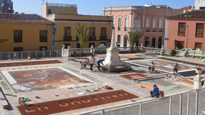 “Empezó en 1847 con dos hermanas Leonor y María Teresa Monteverde del Castillo que viajan a Italia, ven la tradición de las alfombras y la importan a La Orotava”, señala Leo Rodríguez, presidente de la Asociación de Alfombrista. Antes el pueblo honraba al santísimo lanzándoles las flores según iba pasando. Ellas hicieron una alfombra floral por fuera de su casa en ese año,1847. Al siguiente se le une el sirviente de la casa de Lercaro, así nace un recorrido alfombrado.“Cada vez se fueron uniendo más casas, las señoritas de Lugo y Viña, y en principio solo se hacían en las calles de La Orotava. En la plaza del Ayuntamiento hasta 1905 no se empezaron a hacer alfombras. La primera fue para el ministro de marina que vino, no fue para el corpus en sí “, continúa. Ningún año desde 1847 se han dejado de hacer alfombras.