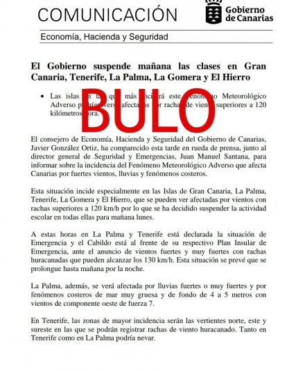 La tarde del lunes, la cuenta oficial de la Consejería de Educación en Twitter tuvo que salir a desmentir un bulo que se había propagado por los chats de WhatsApp de muchos padres y madres de alumnos. Se trataba de un documento con el mismo formato que el utilizado por las administraciones del Gobierno de Canarias que, haciéndose pasar por un comunicado de la Consejería de Economía, Hacienda y Seguridad, aseveraba que las clases del martes se habían cancelado, algo que no era cierto.