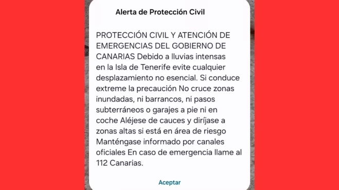El área de Protección Civil y Atención de Emergencias del Gobierno de Canarias ha mandado un mensaje Es-Alert a toda la población de Tenerife este martes a las 21:19 pidiendo evitar "cualquier desplazamiento no esencial" y pidiendo extremar las precauciones en caso de tener que conducir.