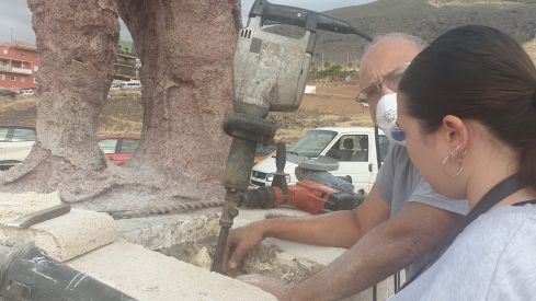 La alcaldesa de Candelaria, Mari Brito, y el concejal de Identidad Canarias y Patrimonio Histórico, Manuel González, resaltan la importancia de este proyecto que pretende restaurar y conservar estas esculturas que datan del año 1959 y que originariamente se encontraban en la Plaza de la Patrona de Canarias.