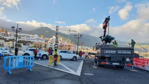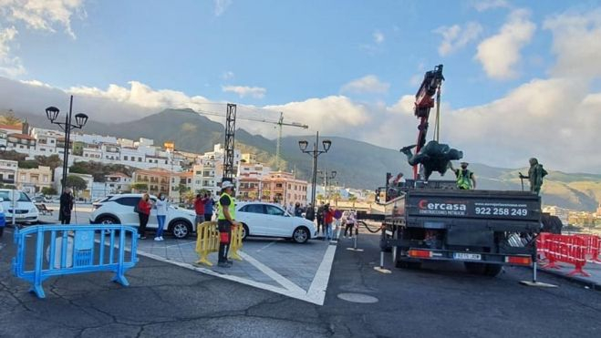El Ayuntamiento de Candelaria, a través de Obras y Servicios, ha retirado dos de las nueve estatuas, las de los menceyes Romen y Tegueste, de la plaza de la Patrona de Canarias por riesgo de caída causa del hundimiento de parte del piso.El mismo ha quedo erosionado por el fuerte oleaje que lleva días afectando a esta zona de la plaza.
