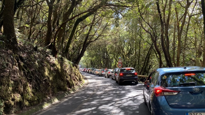 El ejemplo de esto está en la carretera hacia Cruz del Carmen. Según cuentan los testigos, la carretera estaba saturada desde el conocido y popular mirador de Jardina. Al seguir subiendo la cosa no mejora porque el aparcamiento —bastante amplio— del otro famoso mirador está tan lleno de coches que hay una larga cola para entrar.