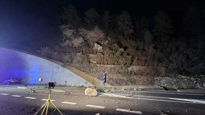 El desprendimiento en un tramo de la TF-5 que afectó a un vehículo terminó la pasada noche con el kilómetro 55, a la altura de Icod de Los Vinos, cortado. Varias piedras cayeron a la carretera en la vía que va dirección a Santa Cruz de Tenerife.