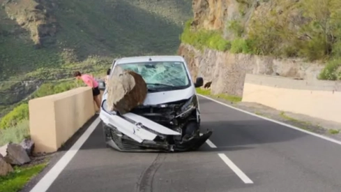 El incidente se ha producido hace pocos minutos y ha provocado la caída de material sobre la calzada. En concreto, una roca del tamaño de un lavavajillas ha aplastado el capó de uno de los vehículos, dentro de un balance de dos coches afectados por el desprendimiento.