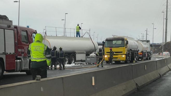 Un camión cisterna ha colisionado en la mañana de este lunes en la TF-1 a la altura de Añaza en dirección sur, causando dos personas heridas además de un derrame de combustible en la vía. El accidente también ha generado fuertes retenciones de tráfico desde la salida de Santa Cruz.
