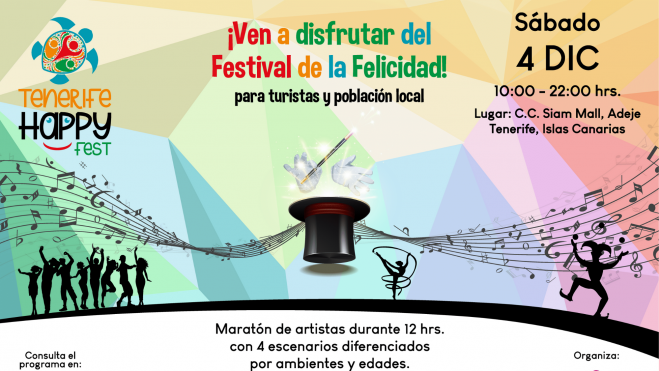 El festival “Tenerife Happy Fest” es una iniciativa creada para atraer a todos los públicos bajo el paraguas de la música, el arte, magia, el humor o la animación. El próximo 4 de diciembre de 2021, como antesala a las fiestas navideñas, tendrá lugar este evento en uno de los puntos neurálgicos de Costa Adeje (sur de Tenerife), situado en el C.C Siam Mall, con una gran afluencia de turistas y residentes, que tiene como objetivo dinamizar las zonas turísticas mostrando la oferta de ocio y animación hotelera que se tiene en Canarias.