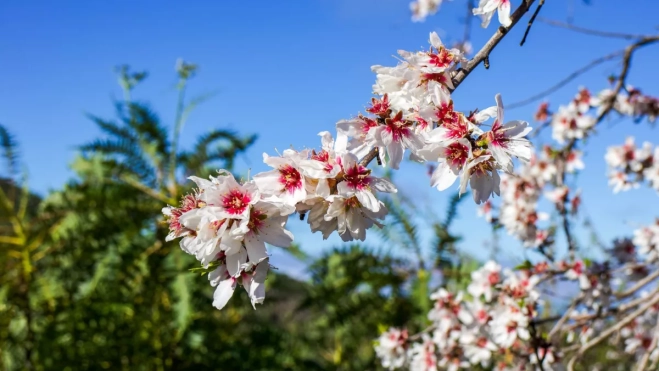 El resto del año, el paisaje es sobrio: bancales, monte bajo, piedra volcánica y senderos que se pierden entre laderas. Pero cuando llega la floración, el contraste es inmediato. Los campos se llenan de árboles cubiertos de flores delicadas que parecen desafiar la dureza del terreno en el que crecen.