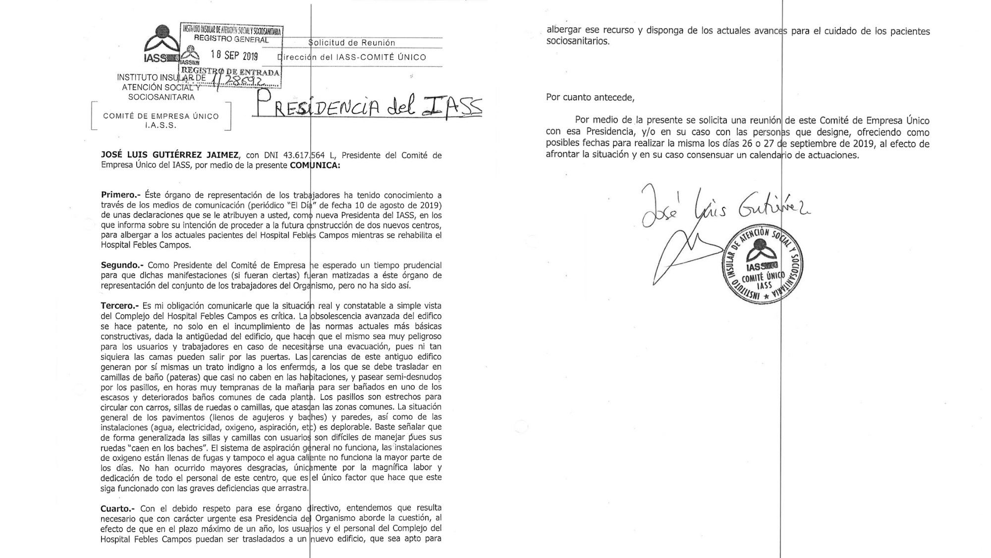 Aquella reunión iba enfocada a diseñar un "plan de choque" contra la falta de medios en el organismo, especialmente en el Hospital Febles Campos, donde desde septiembre el presidente del comité de empresa había denunciado que "la situación real y constatable a simple vista del complejo del hospital Febles Campos" ya era "crítica".