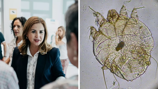 Águeda Fumero, consejera del Área de Acción Social del Cabildo de Tenerife, y una imagen de microscopio de un ácaro arador de la sarna./ MONTAJE AH
