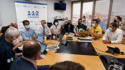 El presidente de Canarias, Ángel Víctor Torres, junto con la ministra de Ciencia e Innovación, Diana Morant, el presidente del Cabildo, Pedro Martín, y los técnicos Marta Moreno y Pedro Martínez, ha especificado que la afección se mantiene en 2.700 hectáreas y el perímetro en 27 kilómetros.