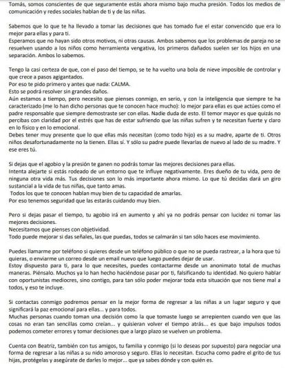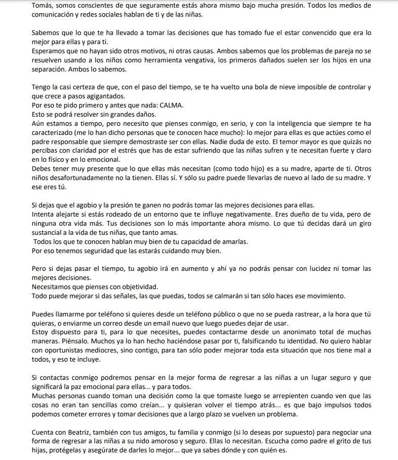 El portavoz de la familia de Olivia y Anna, las niñas desaparecidas en Tenerife, ha publicado una carta en la que apelan directamente a Tomás Antonio G.C, el padre de las menores y quien supuestamente se las llevó para que recapacite y haga alguna señal de que las niñas están a salvo.El portavoz, Joaquin Amills Bonet, ha hecho pública la carta en la que la familia materna de las niñas se dirige directamente a Tomás Antonio G.C con la intención de que dé alguna señal sobre el estado de las pequeñas y que cese de todo intento de esconderlas. "Tengo la casi certeza de que, con el paso del tiempo, se te ha vuelto una bola de nieve imposible de controlar y que crece a pasos agigantados", escribe Bonet y apela a la "calma" ante esta situación; "Esto se podrá resolver sin grandes daños".La carta también hace referencia al agobio que puede sentir ahora Tomás por toda la situación. "Lo mejor para ellas es que actúes como el padre responsable que siempre demostraste ser con ellas", apelan y le aconsejan que intente alejarse "si estás rodeado de un entorno que te influye negativamente. Eres dueño de tu vida pero de ninguna otra vida más", espetan.Además, continúan ese agobio irá en aumento si deja pasar el tiempo y le informan de que "todo puede mejorar si das señales, las que puedas, todos se calmarán si tan solo haces ese movimiento". E instan a Tomás a comunicarse a través de un teléfono público o un correo electrónico. "Es que bajo impulsos todos podemos cometer errores y tomar decisiones que a largo plazo se vuelven problemas", comentan.La familia le pide a Tomás Antonio G.C unas señales "que sean claras... que no sean como esos oportunistas que juegan con tu identidad para obtener dinero y fama... no permitas que otros se hagan pasar por ti. Da señales de que ellas están bien. Haznos llegar vídeos, fotos, imágenes. Ve calmando los ánimos de todos", suplica la familia. Y le piden recapacitar y que actúe a "tiempo antes de que las cosas se compliquen más de lo que ya están".
