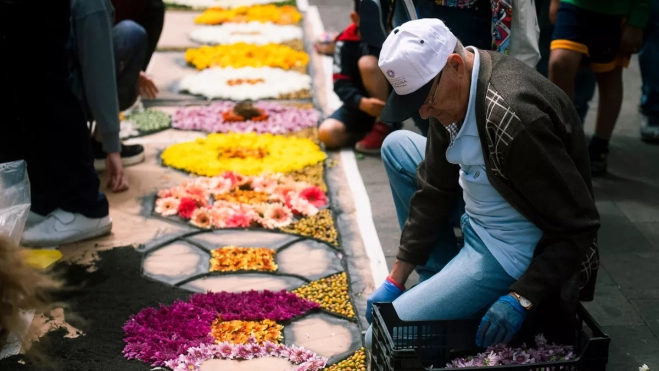 Se han repartido entre los alfombristas unas 40 camionetas de brezo y más de 20.000 flores ornamentales de distintas variedades como rosas, geranios, astromelias, girasoles, claves y gerberas, para reforzar la apuesta de la concejalía de Fiestas por los motivos vegetales y naturales, como arena del volcán de La Palma.