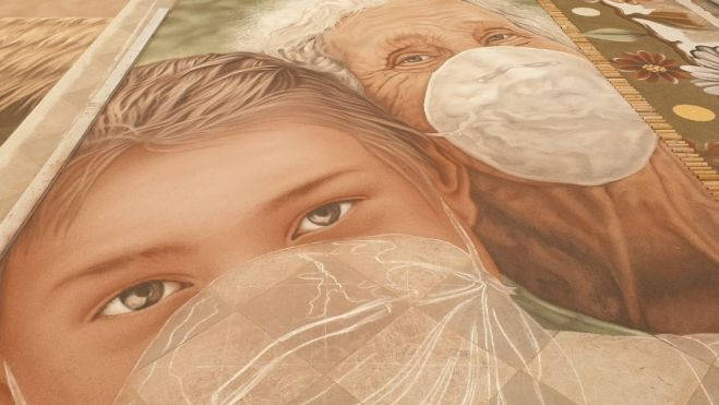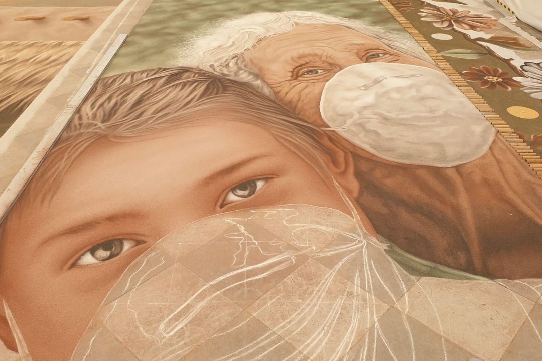 Las alfombras del Corpus Christi de La Orotava y Tacoronte, en Tenerife, tienen este año una dedicatoria especial a las víctimas de la pandemia de la covid-19, y también homenajean a los sanitarios y voluntarios que han estado en todo momento en la primera línea de la lucha contra el virus.En La Orotava se ha retomado este año, tras el parón forzado por la pandemia, la confección del tapiz de la plaza del Ayuntamiento elaborado con arenas naturales del parque nacional del Teide, en dos de cuyos tapices están representados una abuela y su nieta con mascarillas, y una persona hospitalizada y una mano que la acompaña.
