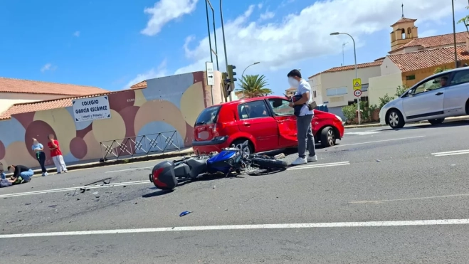 Una colisión entre un coche y una moto registrada este viernes en la carretera general de El Rosario, a la altura del colegio de García Escámez, ha movilizado a los servicios de emergencia.