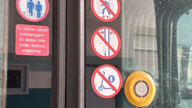 En los vagones del tranvía de Tenerife pueden observarse ya los distintos paneles informativos que alertan de la prohibición de estos vehículos en su interior.