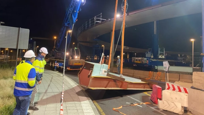 La maniobra de ensamblaje, fue supervisada por el ingeniero y diseñador de la pasarela José Romo quien resaltó que la complejidad de la pieza radica en la “geometría que tiene, ya que es triangular lo que ha motivado que se haya utilizado dos grúas de gran tonelaje”.
