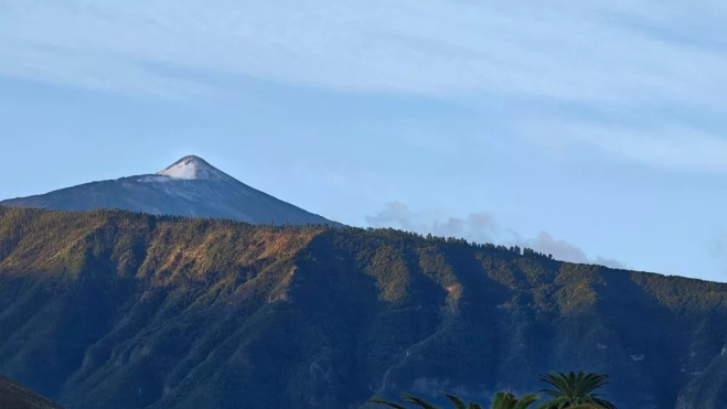 El pico del Teide ha aparecido este jueves ligeramente nevado después del paso de la borrasca Claudia, que ha traído precipitaciones y un descenso acusado de las temperaturas en las cumbres de Tenerife.