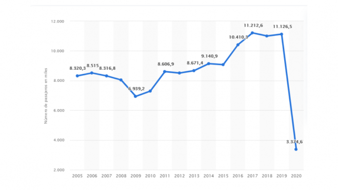 La realidad es que ya en el Plan Director del Aeropuerto Tenerife Sur se habla de la necesidad de un aumento de capacidad en diferentes áreas. “Se cuenta con una única pista de vuelo en el aeropuerto del Sur sin posibilidades, dentro de normas de seguridad, de emplear la calle de rodaje paralela como pista de emergencia y con los condicionantes de su configuración, que invaliden al aeropuerto de Los Rodeos como alternativo”. Por ello, recoge el plan, Aena se plantea la construcción de una segunda pista de vuelo que sirva como solución al colapso de otras pistas.Respecto a la zona de pasajeros establece que “es recomendable la ampliación del Edificio Terminal de Pasajeros a corto plazo, debido a la saturación que aparecerá atendiendo al concepto calidad/diseño”. Ya el propio Plan Director contemplaba las actuaciones que en 2002 se realizaban para solucionar esta falta de capacidad, sin embargo, destaca inmediatamente que estas actuaciones resultarán muy justas “para el tratamiento del pasaje cuando se dé una demanda de 10 millones de pasajeros”.Una cifra que ya se ha sobrepasado, y es que en las últimas décadas ha habido un aumento constante de turistas en el aeropuerto del sur de la isla. Según datos de Statista, en 2005 hubo un tráfico en esta infraestructura de más de ocho millones de personas, mientras que en 2019 el tráfico fue de algo más de 11 millones, una evolución (a excepción de 2009 y 2010 con una caída provocada por la crisis económica) que desde 2011 ha crecido en tres millones de pasajeros.[caption id="attachment_128947" align="alignnone" width="1024"]