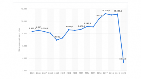 Volumen de tráfico de pasajeros en el aeropuerto de Tenerife Sur de 2005 a 2020 / Statista[/caption]
