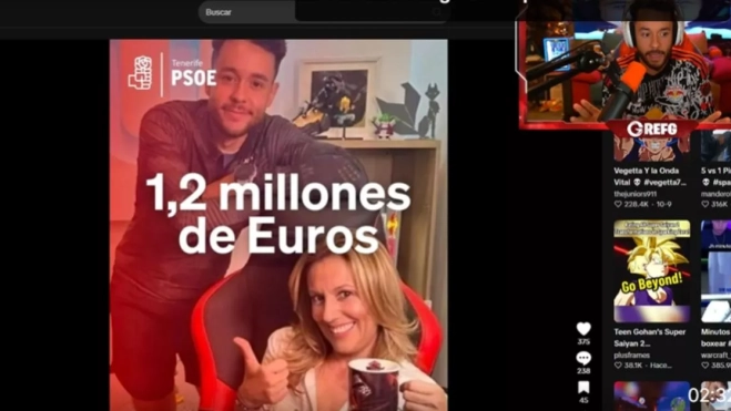 Toda su ira ha comenzado cuando su propia madre le envió un TikTok creado y publicado por la cuenta oficial del PSOE Tenerife en la que sale su viral foto de 2023 en su setup en Tenerife junto a la presidenta del Cabildo de Tenerife, Rosa Dávila, con textos superpuestos en las que se señala que la Corporación va a gastar 1,2 millones de dinero público en los ESLAND en unos premios creados por el polémico influencer que tributa en Andorra y de su polémico ascenso al Teide.