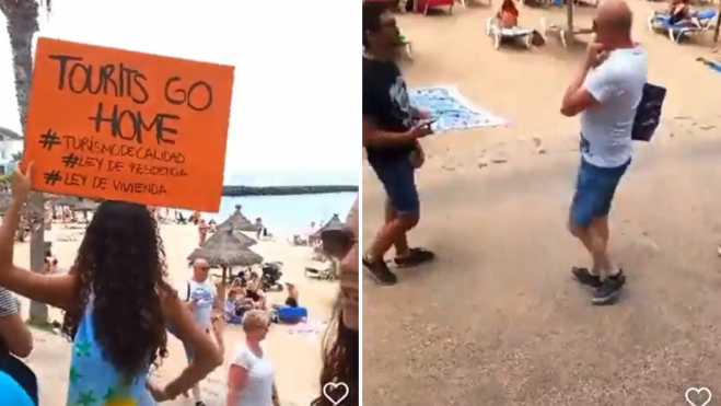 "¿Qué te pasa a ti, mono? ¡Sube, valiente! ¡Guiri, ven aquí! ¡Go home, vete a tu casa!". Son las frases que un manifestante desconocido le grita a un turista, aparentemente extranjero, durante la manifestación de este sábado en Playa de Las Américas contra la masificación turística.