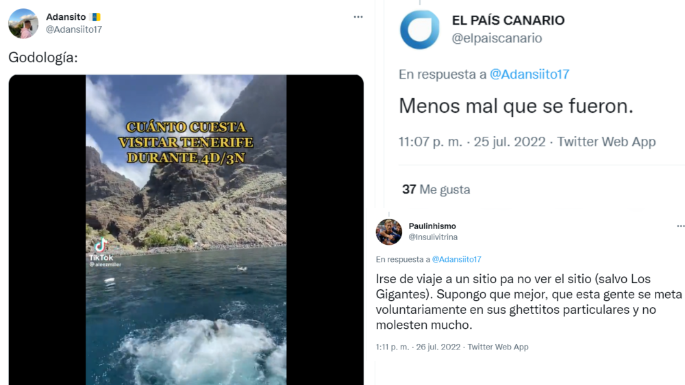 "La godología", comenta un usuario de manera despectiva en Twitter. "Menos mal que se fueron", dice otro usuario llamado "El país canario". Pero, más allá de algunas críticas por su condición de peninsulares, la mayoría de las críticas vienen por los lugares que estos visitantes eligieron ver de Tenerife, sugiriendo que un viaje a Tenerife no es tan caro. "Irse de viaje a un sitio para no ver el sitio (salvo Los Gigantes). Supongo que mejor, que esta gente se meta voluntariamente en sus ghettitos particulares y no molesten mucho", se queja una internauta.