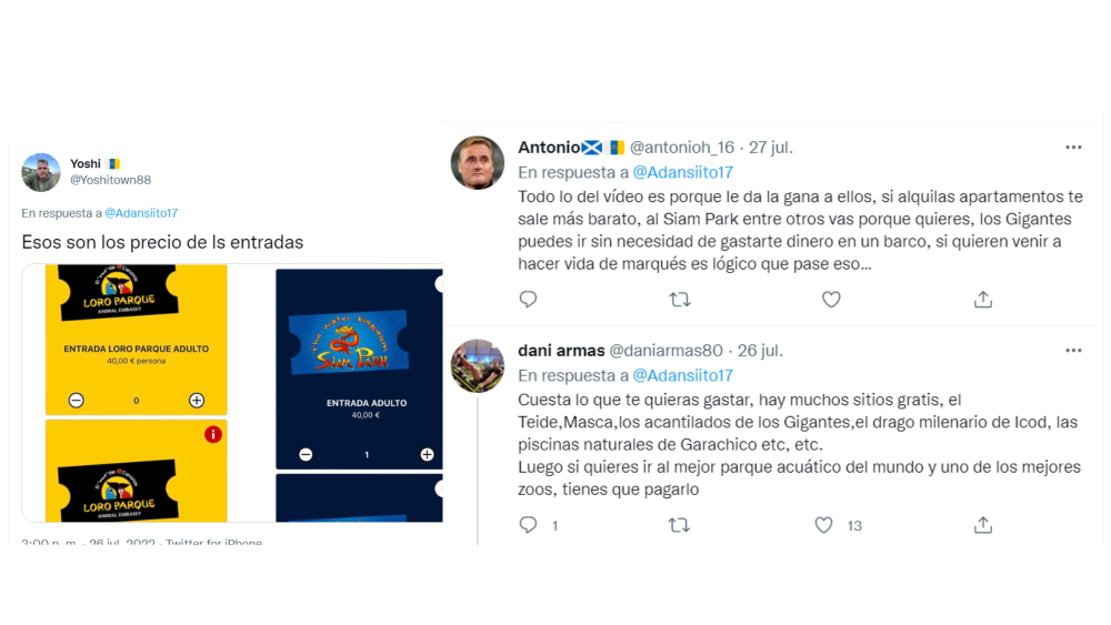 "Todo lo del vídeo es porque le da la gana a ellos, si alquilas apartamentos te sale más barato, al Siam Park entre otros vas porque quieres, Los Gigantes puedes ir sin necesidad de gastarte dinero en un barco, si quieren venir a hacer vida de marqués es lógico que pase eso…", afirma un usuario. "Cuesta lo que te quieras gastar, hay muchos sitios gratis: el Teide, Masca, los acantilados de los Gigantes, el drago milenario de Icod, las piscinas naturales de Garachico etc., etc. Luego si quieres ir al mejor parque acuático del mundo y uno de los mejores zoos, tienes que pagarlo", añade otro.