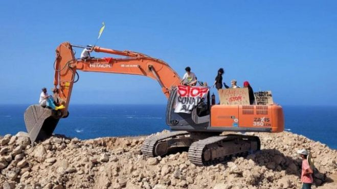 Un grupo de personas contrarias a la construcción del proyecto turístico Cuna del Alma, en el Puertito de Adeje, y que forman parte de la acampada que desde hace días se ha instalado en el entorno de las pbras, se han encadenado a las grúas y han prometido no bajarse hasta que paren las obras que, según argumentan, "no tienen memoria ambiental con rigor técnico ni profesional".